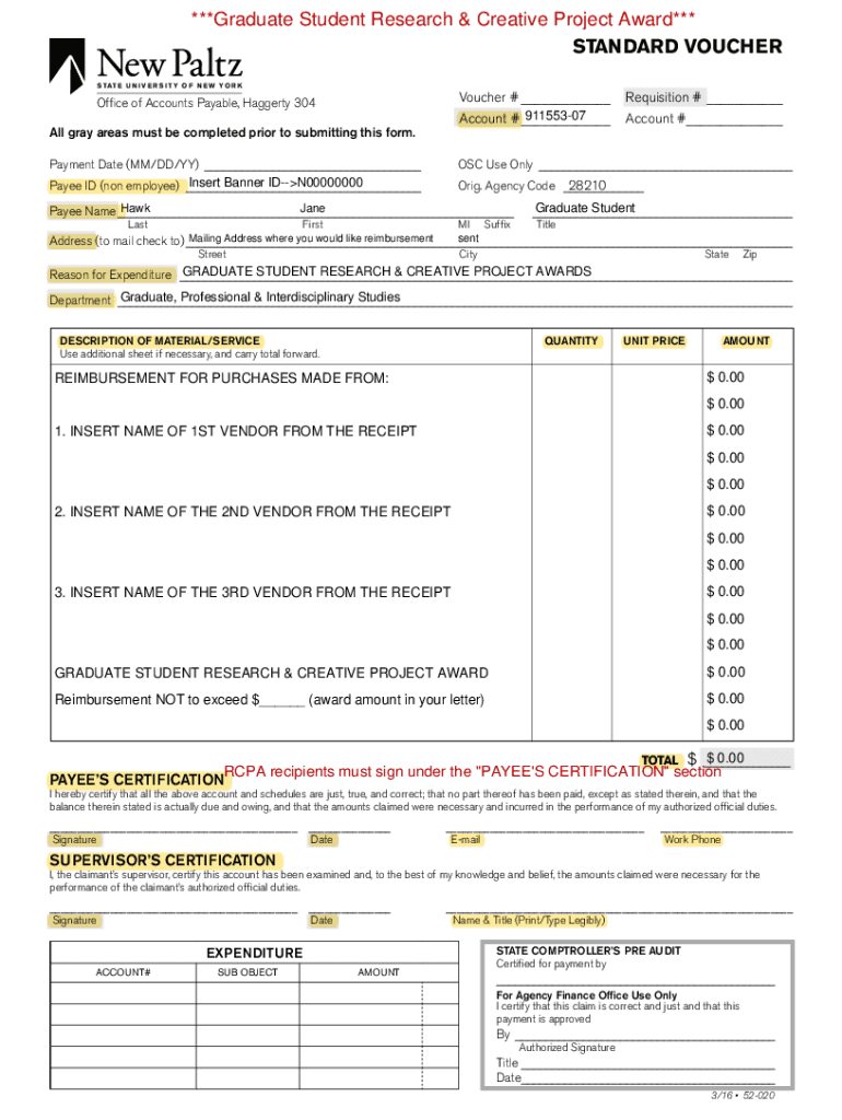 ***Graduate Student Research & Creative Project Award***STANDARD VOUCHER S TAT E U N I V E R S I T Y O F N E W Y O R Voucher #___Requisition #___ 91155307 Account #___Account #___Office of Accounts