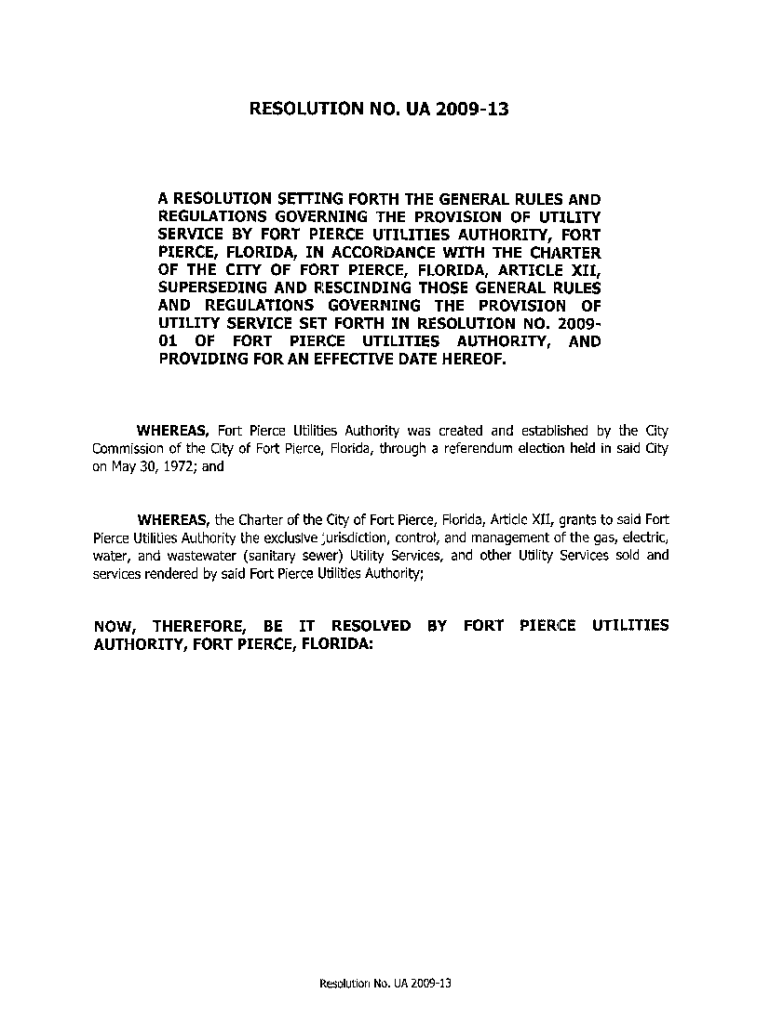RESOLUTION NO. UA 200913A RESOLUTION SE\'THING FORTH THE GENERAL RULES AND REGULATIONS GOVERNING THE PROVISION OF UTILITY SERVICE BY FORT PIERCE UTILITIES AUTHORITY, FORT PIERCE, FLORIDA, IN ACCORDANCE