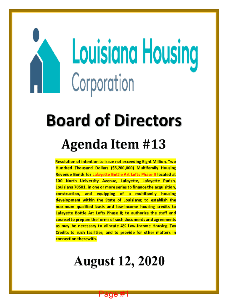 Board of Directors Agenda Item #13 Resolution of intention to issue not exceeding Eight Million, Two Hundred Thousand Dollars ($8,200,000) Multifamily Housing Revenue Bonds for Lafayette Bottle Art