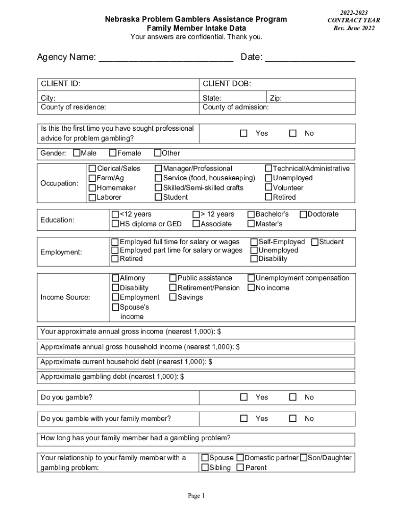 20222023 CONTRACT YEAR Rev. June 2022Nebraska Problem Gamblers Assistance Program Family Member Intake Data Your answers are confidential. Thank you. Agency Name: ___ Date: ___ CLIENT ID:CLIENT DOB:City: