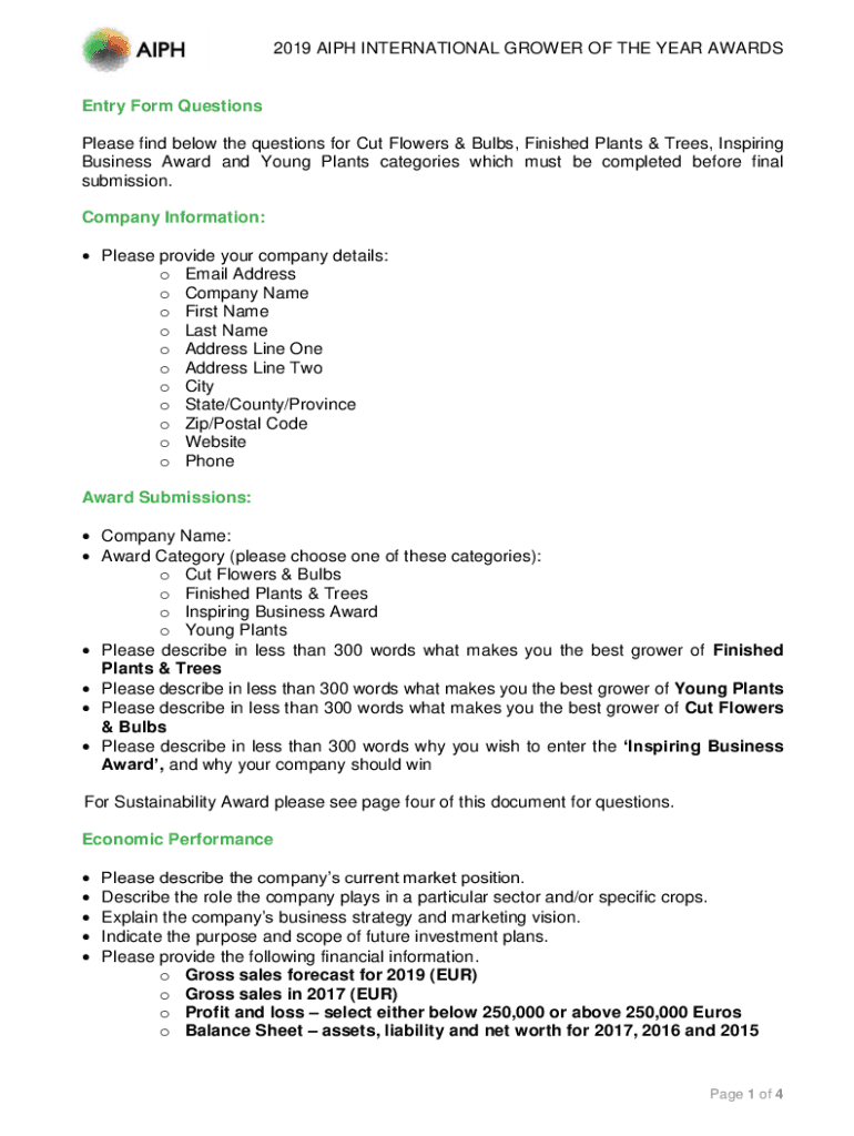 2019 AIH INTERNATIONAL GROWER OF THE YEAR AWARDSEntry Form Questions Please find below the questions for Cut Flowers & Bulbs, Finished Plants & Trees, Inspiring Business Award and Young Plants categories