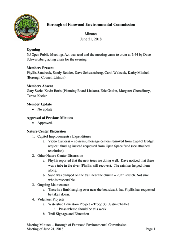 Borough of Fan wood Environmental Commission Minutes June 21, 2018, Opening NJ Open Public Meetings Act was read and the meeting came to order at 7:44 by Dave Schwartz berg acting chair for the evening.