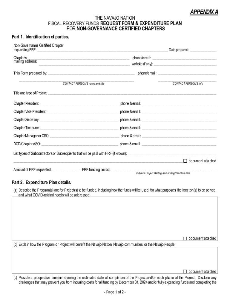 APPENDIX THE NAVAJO NATION FISCAL RECOVERY FUNDS REQUEST FORM & EXPENDITURE PLATFORM GOVERNANCE CERTIFIED CHAPTERSPart 1. Identification of parties. Governance Certified Chapter requesting FRF:___Chapters
