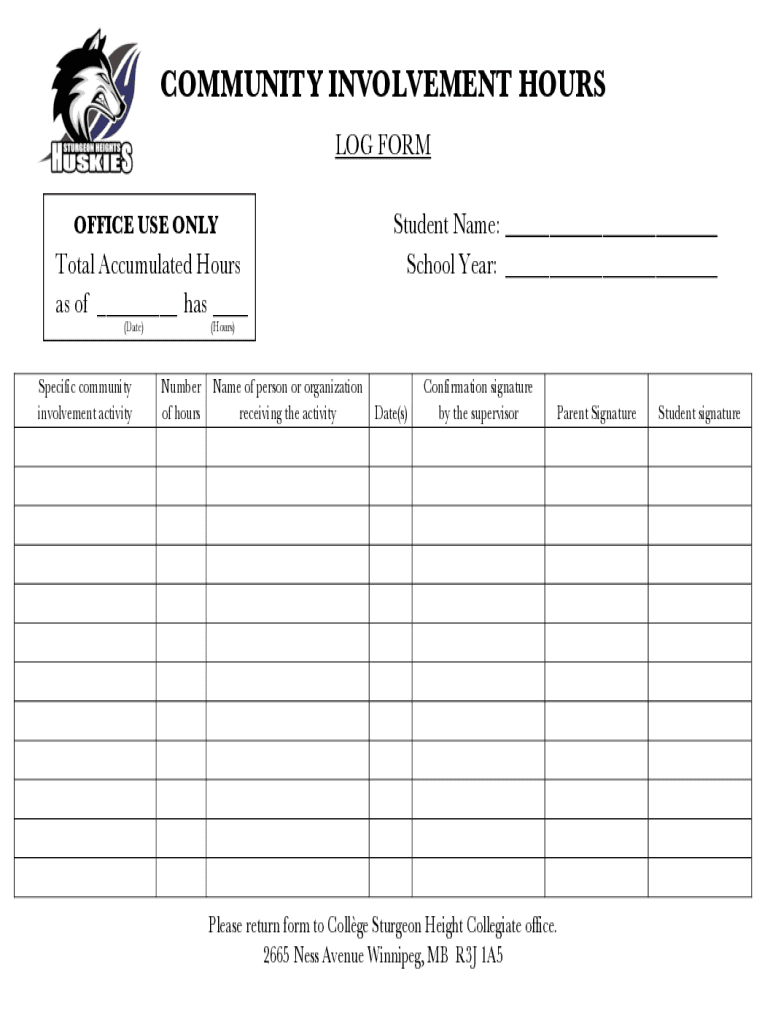 COMMUNITY INVOLVEMENT HOURS LOG FORM OFFICE USE ONLYTotal Accumulated Hours as of ___ has ___ (Date)Specific community involvement activityStudent Name: ___ School Year: ___(Hours)Number of surname