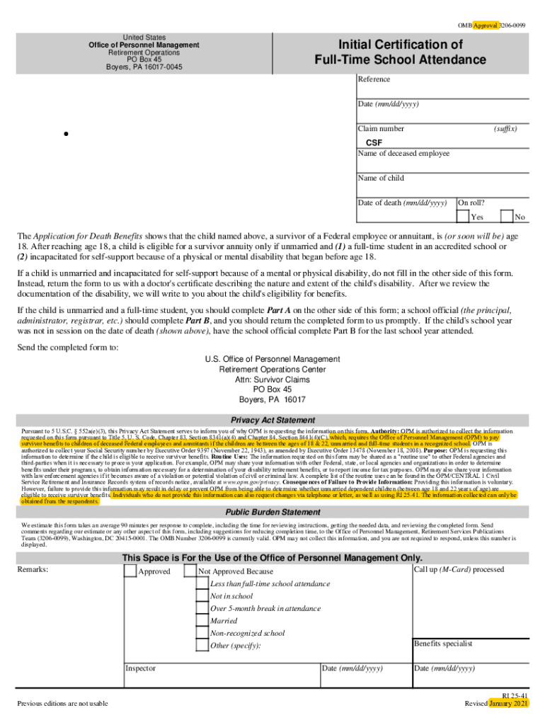 OMB Approval 32060099United States Office of Personnel Management Retirement Operations PO Box 45 Boyer's, PA 160170045Initial Certification of Halftime School Attendance Reference Date (mm/dd/YYY)
