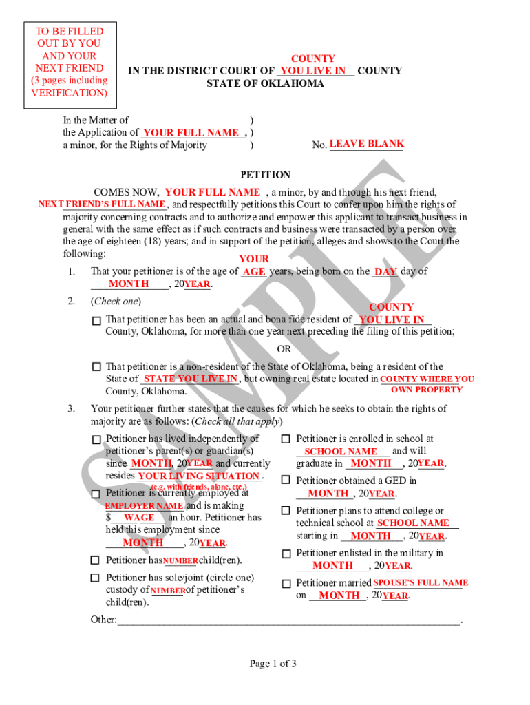 TO BE FILLED OUT BY YOU AND YOUR NEXT FRIEND (3 pages including VERIFICATION)COUNTY IN THE DISTRICT COURT OF ___ YOU LIVE IN COUNTY STATE OF Oklahoman the Matter of) the Application of ___, YOUR FULL