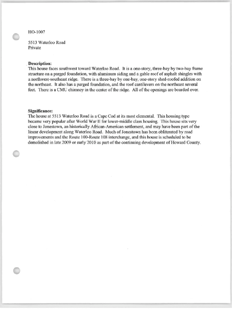 HO1007 5513 Waterloo Road PrivateDescription: This house faces southwest toward Waterloo Road. It is a one story, three bay by two bay frame structure on a parked foundation, with aluminum siding