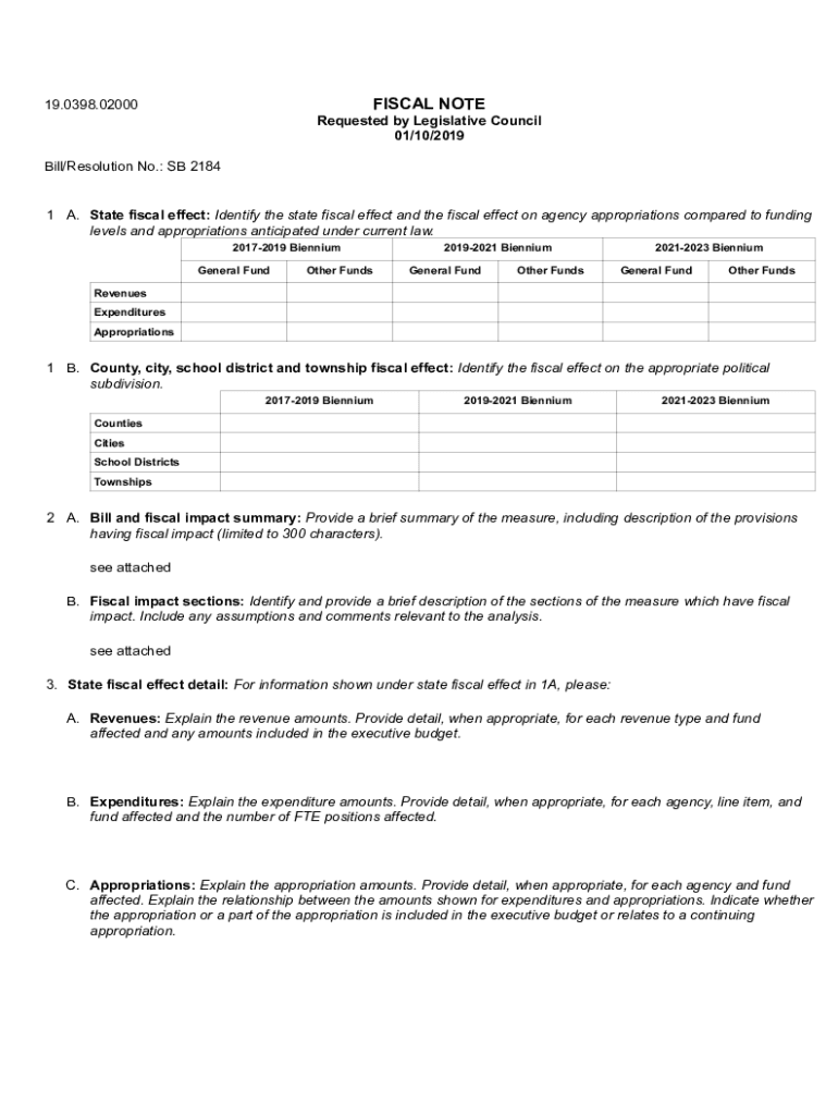 FISCAL NOTE19.0398.02000Requested by Legislative Council 01/10/2019 Bill/Resolution No.: SB 21841 A. State fiscal effect: Identify the state fiscal effect and the fiscal effect on agency appropriations