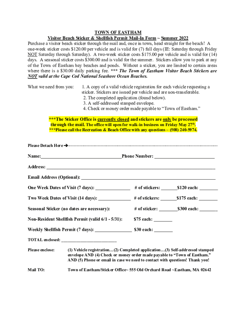 TOWN OF EASTMAN Visitor Beach Sticker & Shellfish Permit Mailing Form Summer 2022 Purchase a visitor beach sticker through the mail and, once in town, head straight for the beach! A one-week sticker