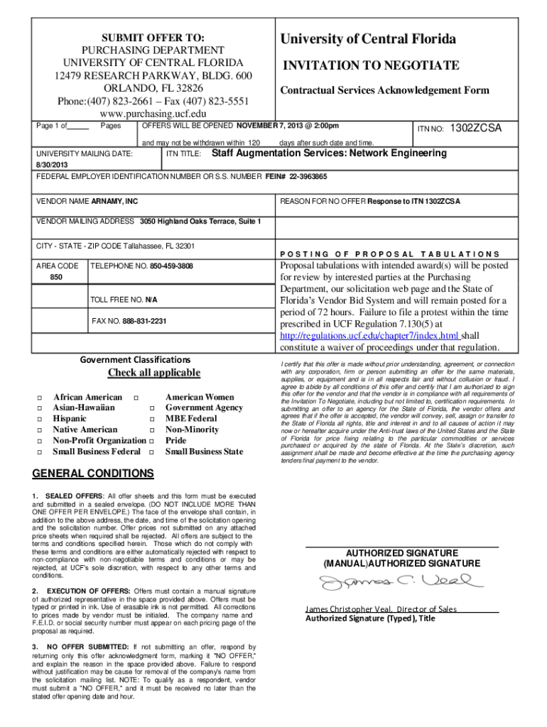 SUBMIT OFFER TO: PURCHASING DEPARTMENT UNIVERSITY OF CENTRAL FLORIDA 12479 RESEARCH PARKWAY, BLDG. 600 ORLANDO, FL 32826 Phone:(407) 8232661 Fax (407) 8235551 www.purchasing.ucf.edu Page 1 ofPagesUniversity