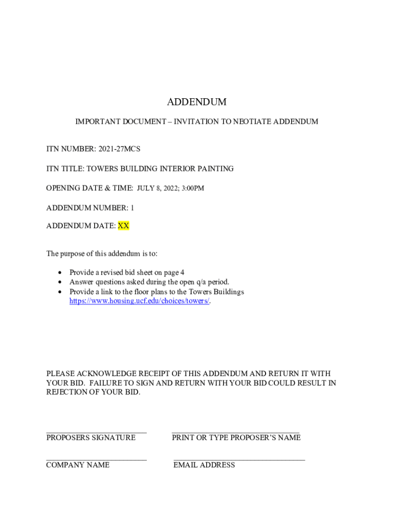 ADDENDUM IMPORTANT DOCUMENT INVITATION TO NEGOTIATE ADDENDUM ITN NUMBER: 202127MCS ITN TITLE: TOWERS BUILDING INTERIOR PAINTING OPENING DATE & TIME: JULY 8, 2022; 3:00PM ADDENDUM NUMBER: 1 ADDENDUM