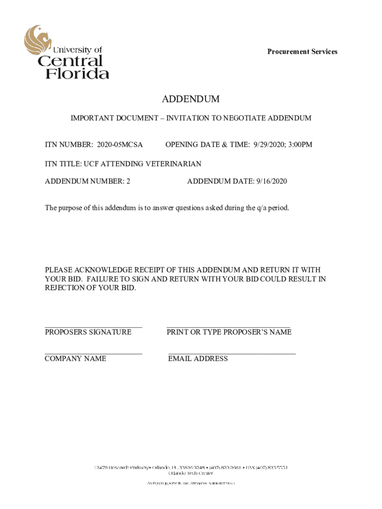 Procurement ServicesADDENDUM IMPORTANT DOCUMENT INVITATION TO NEGOTIATE ADDENDUM ITN NUMBER: 202005MCSAOPENING DATE & TIME: 9/29/2020; 3:00PMITN TITLE: UCF ATTENDING VETERINARIAN ADDENDUM NUMBER: