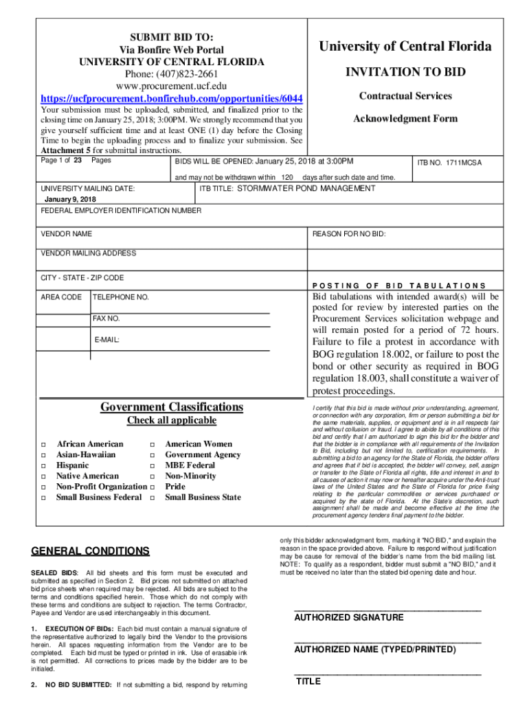 SUBMIT BID TO: Via Bonfire Web Portal UNIVERSITY OF CENTRAL FLORIDA Phone: (407)8232661 www.procurement.ucf.edu https://ucfprocurement.bonfirehub.com/opportunities/6044 Your submission must be uploaded,