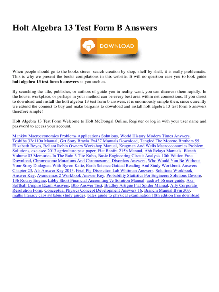 Holt Algebra 13 Test Form B AnswersWhen people should go to the books stores, search creation by shop, shelf by shelf, it is really problematic. This is why we present the books compilations in this