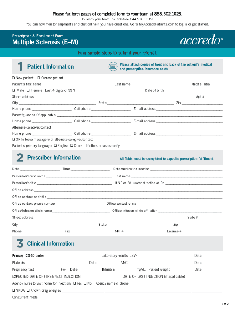 Please fax both pages of completed form to your team at 888.302.1028. To reach your team, call toll-free 844.516.3319. You can now monitor shipments and chat online if you have questions. Go to MyAccredoPatients.com