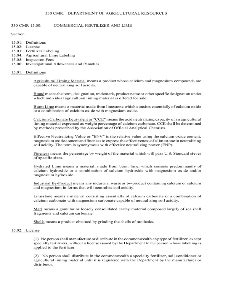 330 CMR: DEPARTMENT OF AGRICULTURAL RESOURCES 330 CMR 15.00:COMMERCIAL FERTILIZER AND Dissection 15.01: 15.02: 15.03: 15.04: 15.05: 15.06:Definitions License Fertilizer Labeling Agricultural Lime