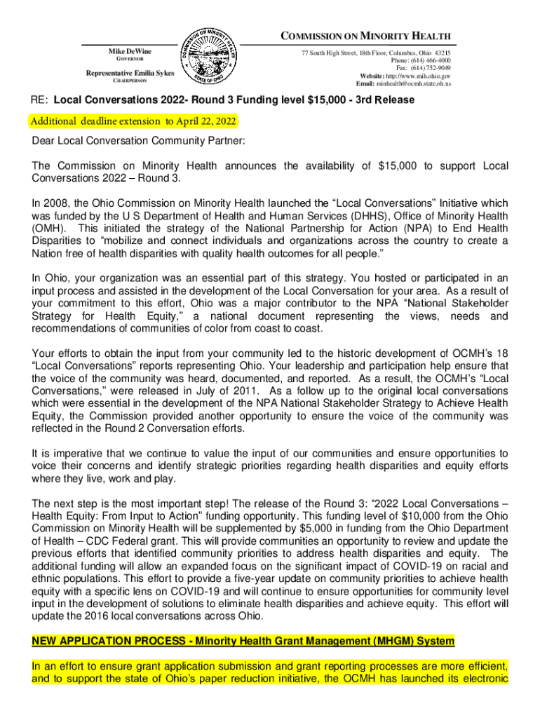 COMMISSION ON MINORITY HEALTH Mike DeWine GOVERNOR Representative Emilia Sykes CHAIRPERSON77 South High Street, 18th Floor, Columbus, Ohio 43215 Phone: (614) 4664000 Fax: (614) 7529049 Website: http://www.mih.ohio.gov