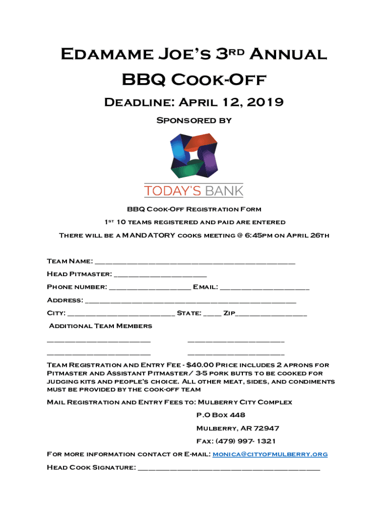 Edamame Joe's 3rd Annual BBQ Cookout Rules and Regulations for Edamame BBQ Cookout April 27, 2019, Deadline: April 12, 2019, Cooks are required to cook all meat provided: Saturday turns in times:Pork