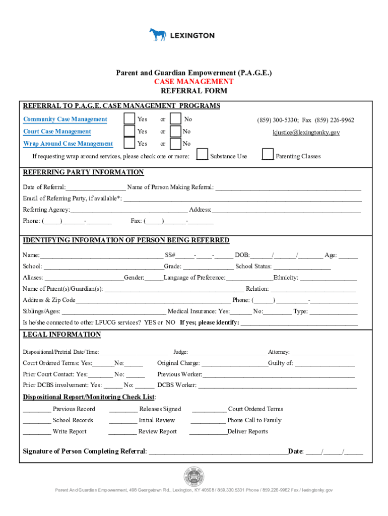 Parent and Guardian Empowerment (P.A.G.E.) CASE MANAGEMENT REFERRAL FORM REFERRAL TO P.A.G.E. CASE MANAGEMENT PROGRAMS Community Case ManagementYesorNo(859) 3005330; Fax (859) 2269962Court Case ManagementYesorNokjustice@lexingtonky.govWrap