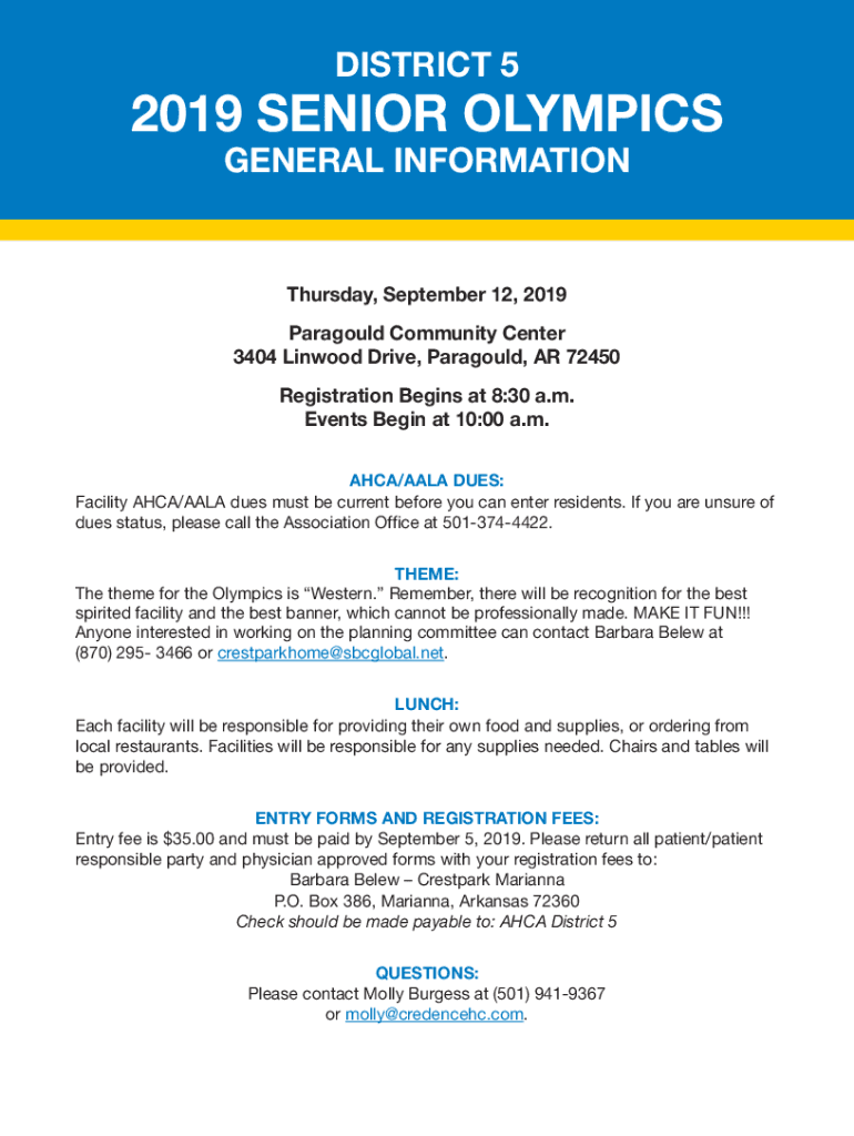DISTRICT 52019 SENIOR OLYMPICS GENERAL INFORMATION Thursday, September 12, 2019, Paragould Community Center 3404 Linwood Drive, Paragould, AR 72450 Registration Begins at 8:30 a.m. Events Begin at