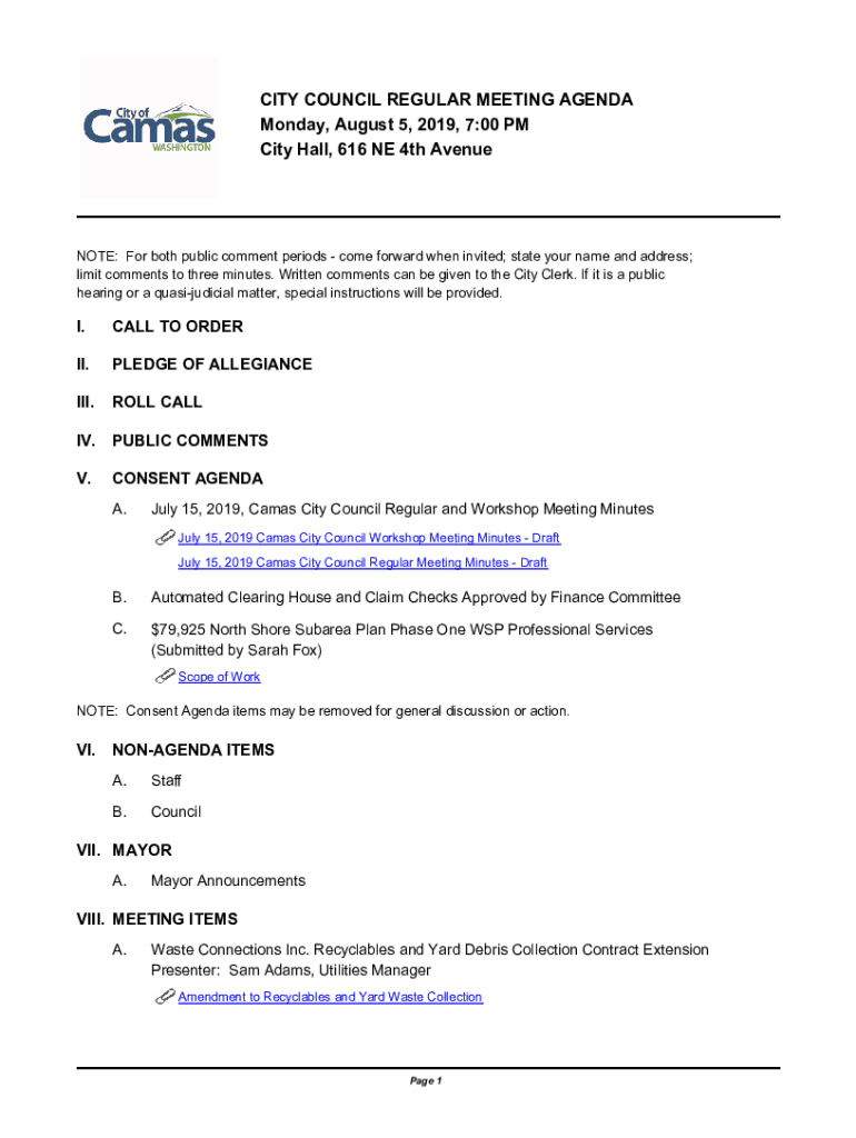 CITY COUNCIL REGULAR MEETING AGENDA Monday, August 5, 2019, 7:00 PM City Hall, 616 NE 4th AvenueNOTE: For both public comment periods come forward when invited; state your name and address; limit