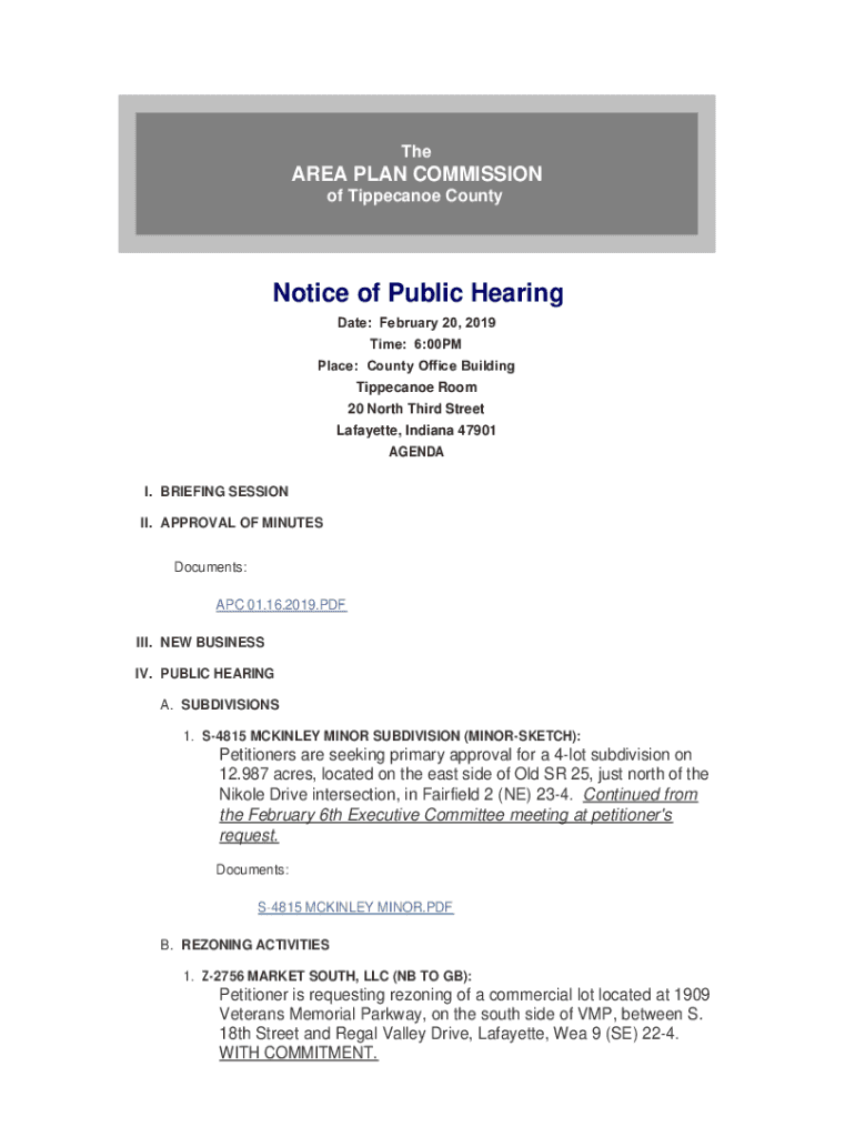 There PLAN COMMISSION of Tippecanoe CountyNotice of Public Hearing Date: February 20, 2019, Time: 6:00PM Place: County Office Building Tippecanoe Room 20 North Third Street Lafayette, Indiana 47901