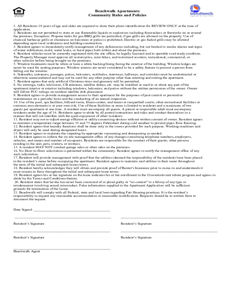 Beach walk Apartments Community Rules and Policies 1. All Residents 18 years of age and older are required to show their photo identification for REVIEW ONLY at the time of application. 2. Residents