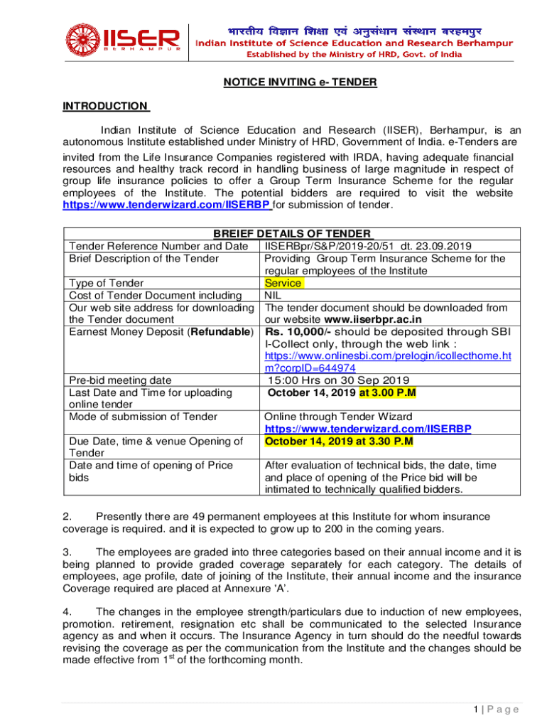 NOTICE INVITING e TENDER INTRODUCTION Indian Institute of Science Education and Research (WISER), Berhampur, is an autonomous Institute established under Ministry of HRD, Government of India. Tenders