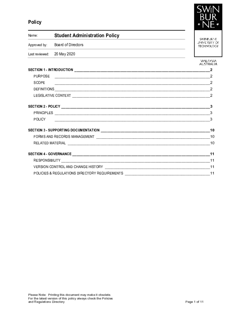 Policy Name:Student Administration PolicyApproved by:Board of DirectorsLast reviewed:20 May 2020SECTION 1 INTRODUCTION ___ 2 PURPOSE___ 2SCOPE___ 2DEFINITIONS ___ 2 LEGISLATIVE CONTEXT ___ 2 SECTION