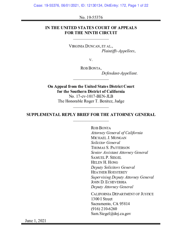 Case: 1955376, 06/01/2021, ID: 12130134, Entry: 172, Page 1 of 22No. 1955376 IN THE UNITED STATES COURT OF APPEALS FOR THE NINTH CIRCUIT ___VIRGINIA DUNCAN, ET AL., PlaintiffsAppellees, V.ROB BONITA,