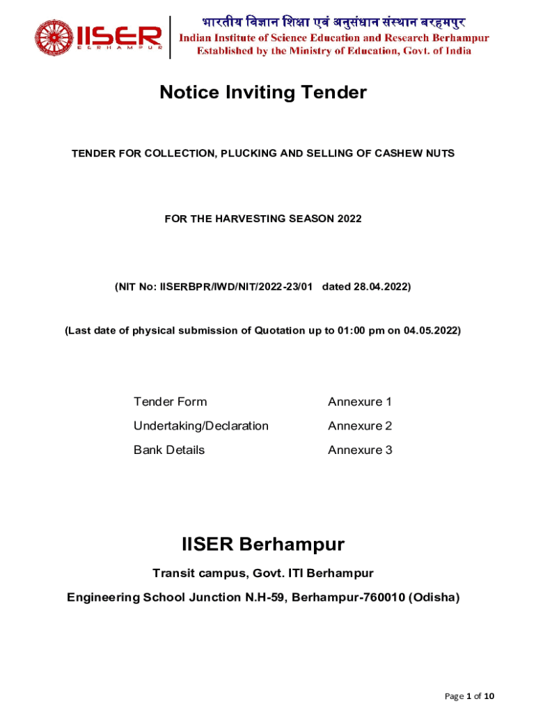 Notice Inviting Tender FOR COLLECTION, PLUCKING AND SELLING OF CASHEW AUTHOR THE HARVESTING SEASON 2022(NIT No: INSERR/ID/NIT/202223/01 dated 28.04.2022)(Last date of physical submission of Quotation