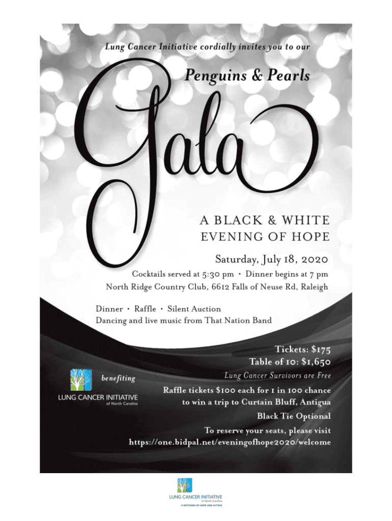 The 13th Annual Evening of Hope will unite people to make a difference for lung cancer across North Carolina. The event will be held at the North Ridge Country Club on Saturday, April 25, 2020, and