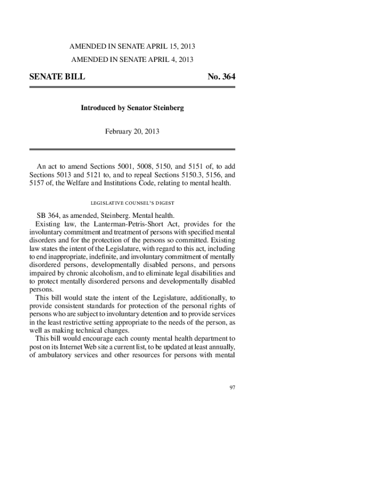 AMENDED IN SENATE APRIL 15, 2013, AMENDED IN SENATE APRIL 4, 2013SENATE BILL No. 364Introduced by Senator Steinberg February 20, 2013An act to amend Sections 5001, 5008, 5150, and 5151 of, to add