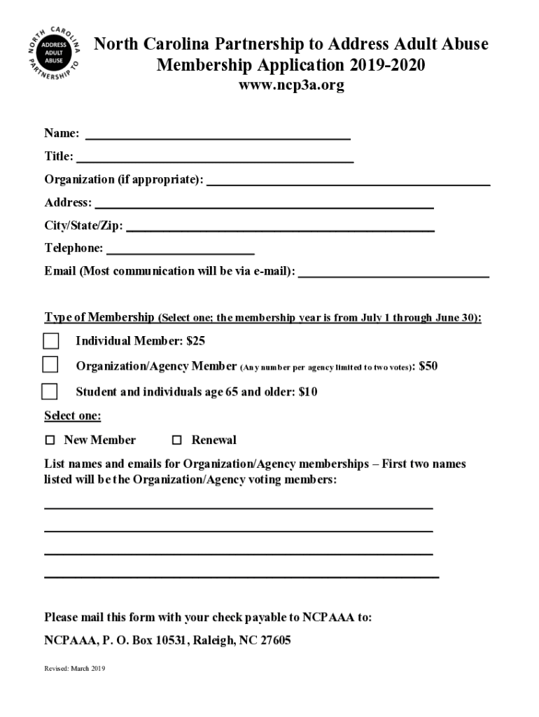North Carolina Partnership to Address Adult Abuse Membership Application 20192020 www.ncp3a.org Name: ___ Title: ___ Organization (if appropriate): ___ Address: ___ City/State/Zip: ___ Telephone:
