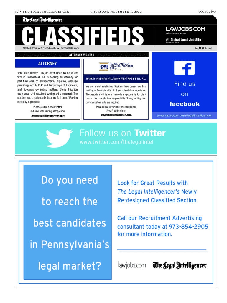 Ate's s Great easy to read format T H URS DAY, N OF E MB E R 3, 2 0 2 2VOL P. 2400 Reach over 12,000 daily print readers Get more value and more space for the same price Your job posting also goes