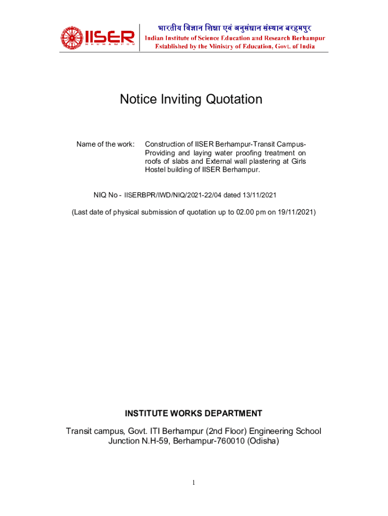 Name of the work:Construction of WISER BerhampurTransit CampusProviding and laying water proofing treatment on
