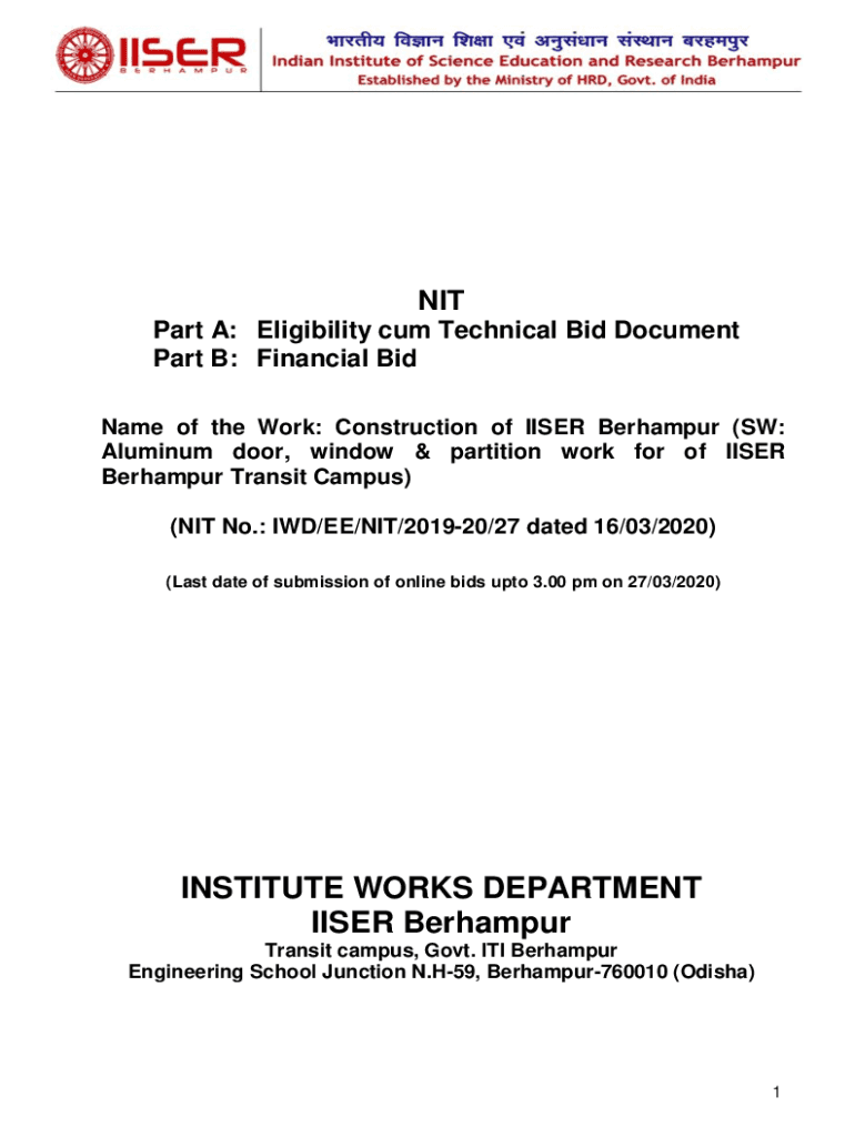 NIT Part A: Eligibility come Technical Bid Document Part B: Financial Bid Name of the Work: Construction of WISER Berhampur (SW: Aluminum door, window & partition work for of WISER Berhampur Transit
