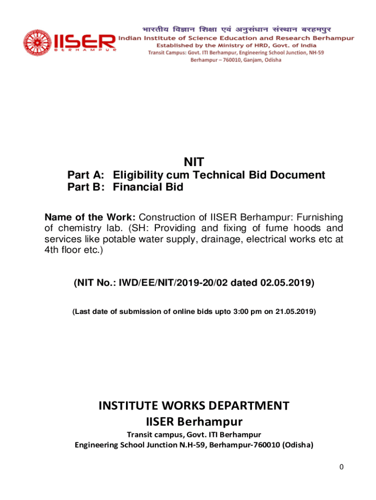 Name of the Work: Construction of WISER Berhampur: Furnishing