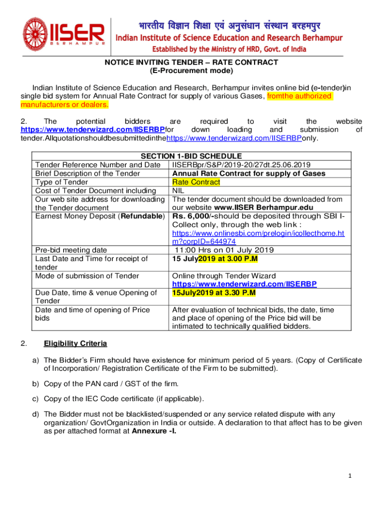 NOTICE INVITING TENDER RATE CONTRACT (Procurement mode) Indian Institute of Science Education and Research, Berhampur invites online bid (tender)in single bid system for Annual Rate Contract for supply