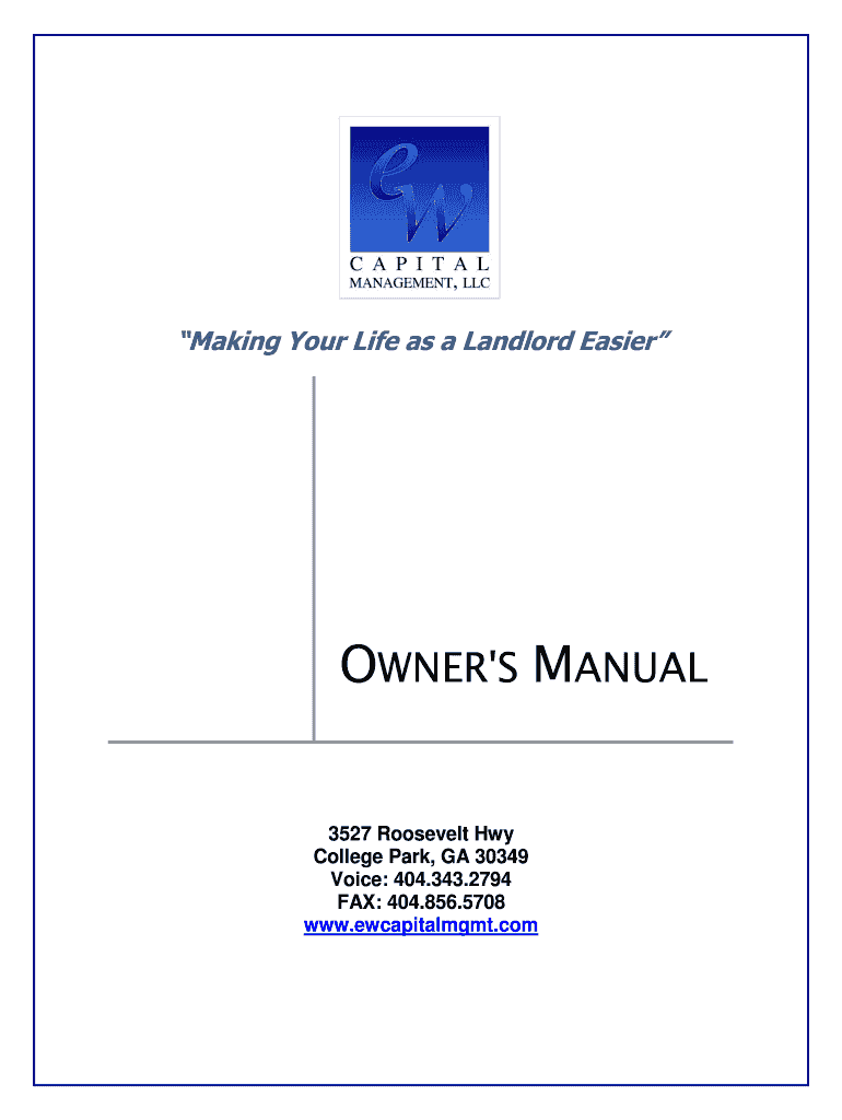 Making Your Life as a Landlord Easier OWNER IS MANUAL 3527 Roosevelt Hwy College Park, GA 30349 Voice: 404.343.2794 FAX: 404.856.5708 www.ewcapitalmgmt.com Table of Contents Welcome..........................................................................................................................................5