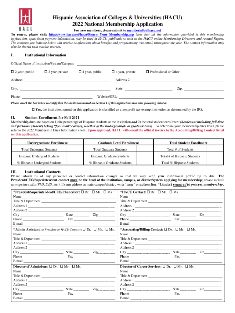 Hispanic Association of Colleges & Universities (HACK) 2022 National Membership Application For new members, please submit to memberinfo@hacu.net To renew, please visit: http://www.hacu.net/hacu/Renew_Your_Membership.asp