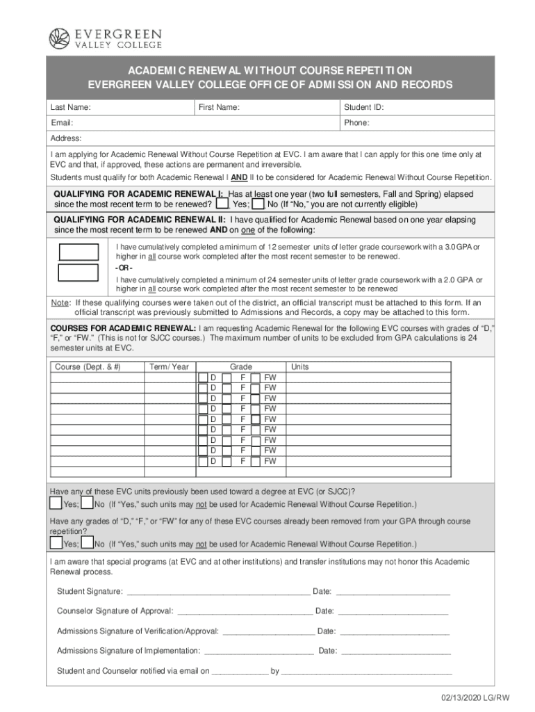 Get the free ACADEMIC RENEWAL WITHOUT COURSE REPETITION EVERGREEN VALLEY COLLEGE ...