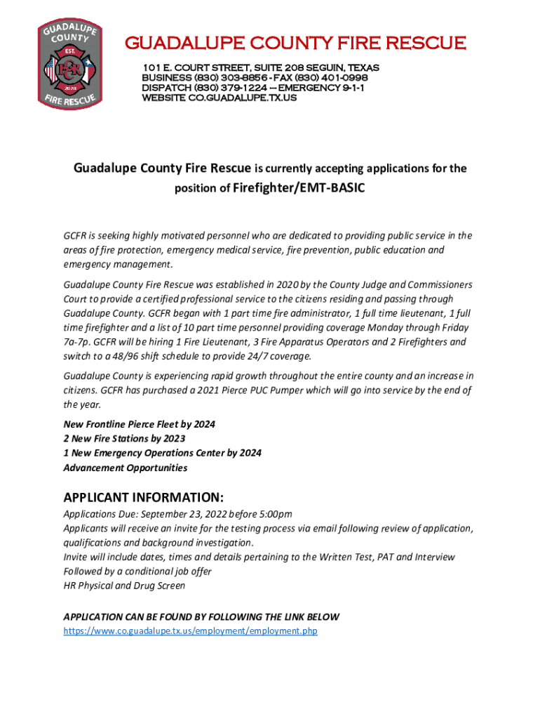 GUADALUPE COUNTY FIRE RESCUE 101 E. COURT STREET, SUITE 208 SEGUIN, TEXAS BUSINESS (830) 3038856 FAX (830) 4010998 DISPATCH (830) 3791224 EMERGENCY 911 WEBSITE CO.GUADALUPE.TX.US Guadalupe County