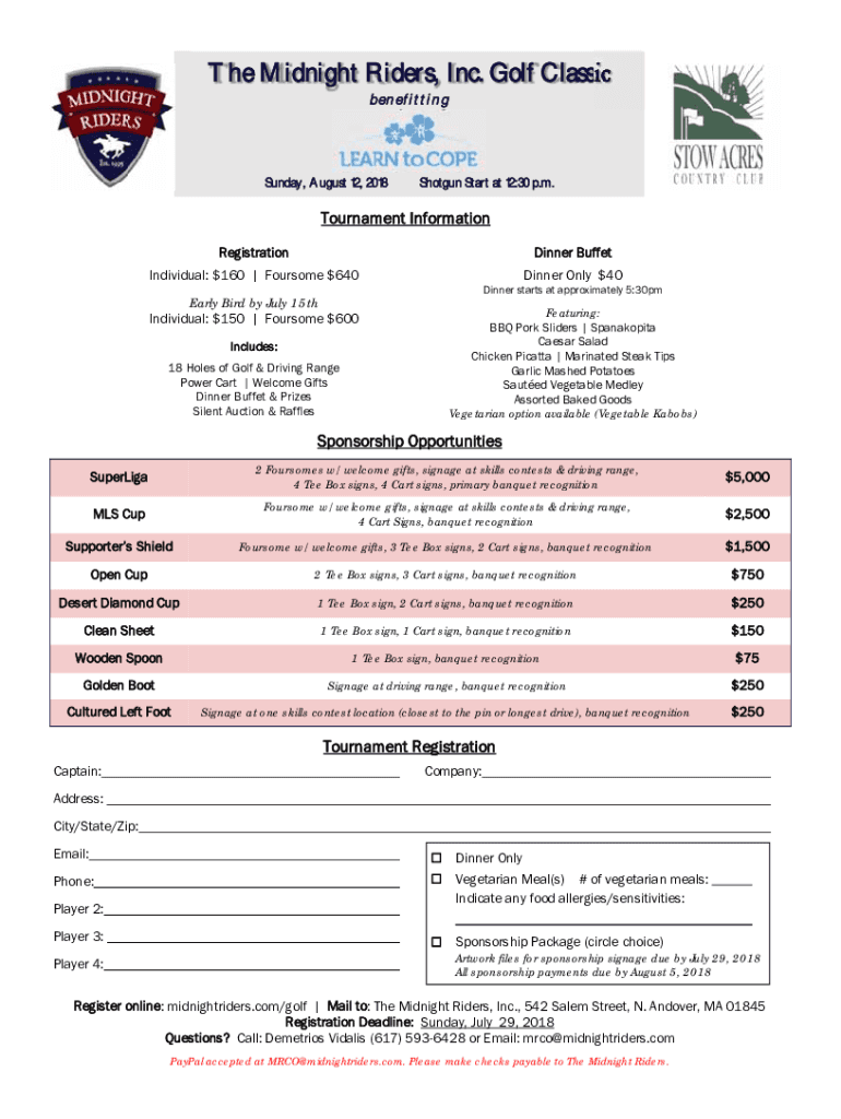 The Midnight Riders, Inc. Golf Classic benefittingSunday, August 12, 2018Shotgun Start at 12:30 p.m. Tournament Information RegistrationDinner Buffet Individual: $160 | Foursome $640Dinner Only $40