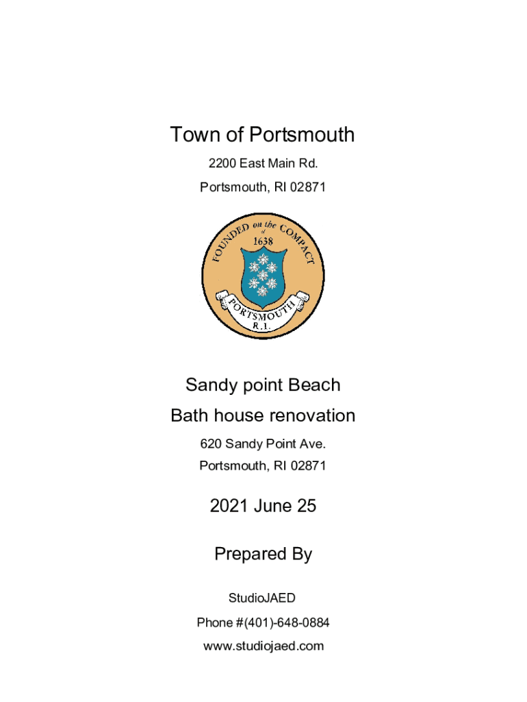 Town of Portsmouth 2200 East Main Rd. Portsmouth, RI 02871Sandy point Beach Bath house renovation 620 Sandy Point Ave. Portsmouth, RI 028712021 June 25 Prepared By Studied Phone # (401)6480884 www.studiojaed.comTown