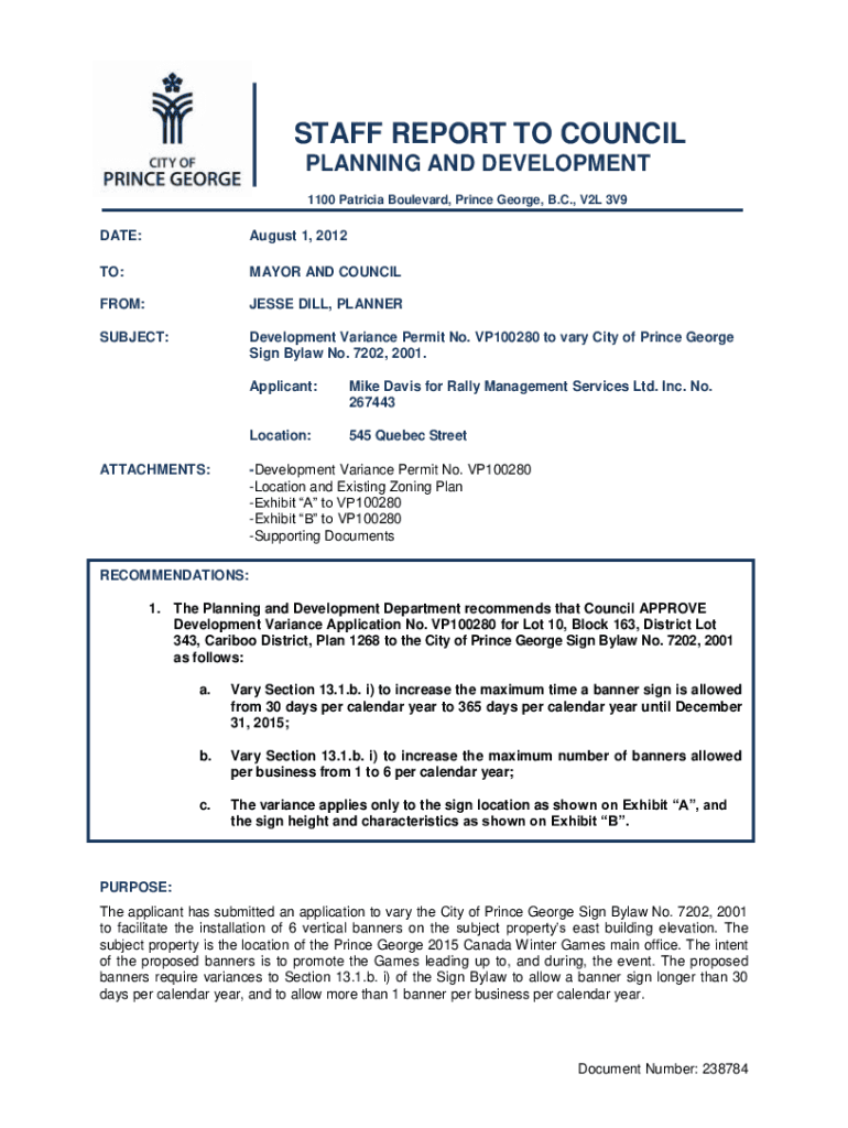 STAFF REPORT TO COUNCIL CITY PRINCE GEORGEPLANNING AND DEVELOPMENT 1100 Patricia Boulevard, Prince George, B.C., V2L 3V9DATE:August 1, 2012TO:MAYOR AND COUNCILOR:JESSE DILL, PLANNERSUBJECT:Development