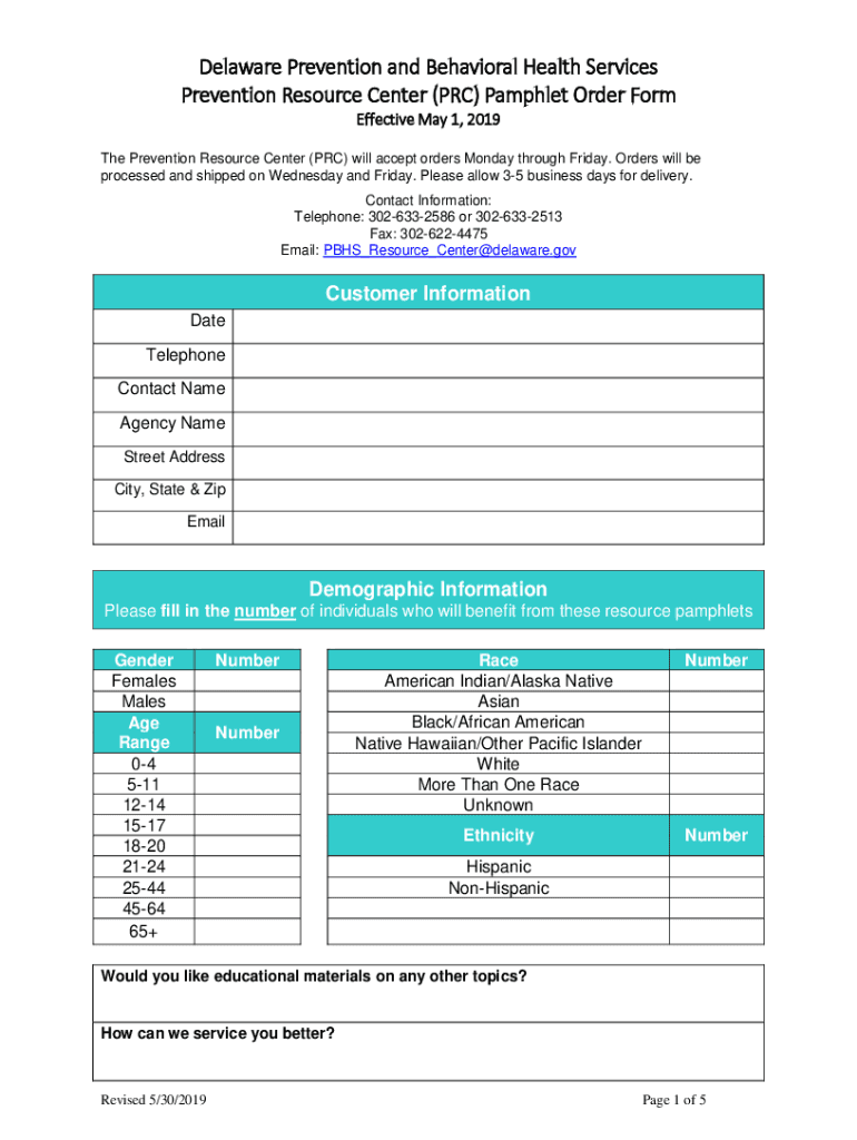 Delaware Prevention and Behavioral Health Services Prevention Resource Center (PRC) Pamphlet Order Form Effective May 1, 2019, The Prevention Resource Center (PRC) will accept orders Monday through