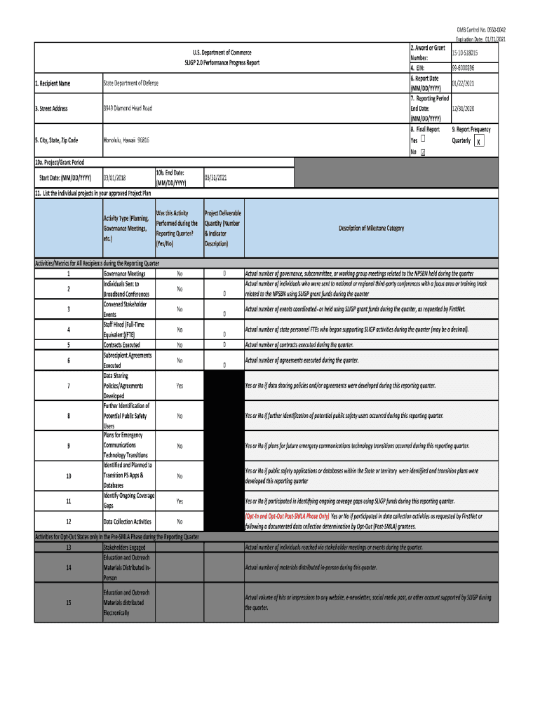 0 MB Control No. 06600042 Ex ration Date: 01 31 20212. Award or Grant. S. Department of CommerceNumber:SLIP 2.0 Performance Progress Report1. Recipient Namesake Department of Defense3. Street Address3949