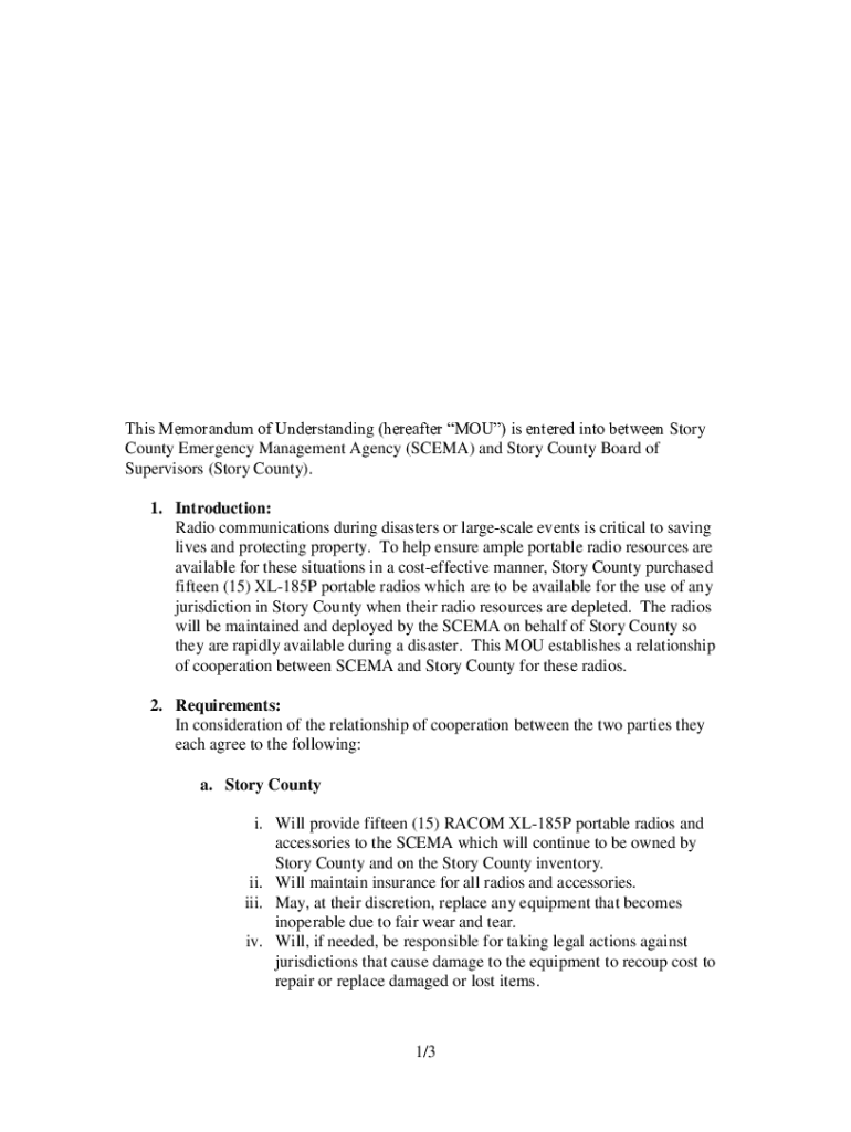 This Memorandum of Understanding (hereafter YOU) is entered into between Story County Emergency Management Agency (SCHEMA) and Story County Board of Supervisors (Story County). 1. Introduction: Radio