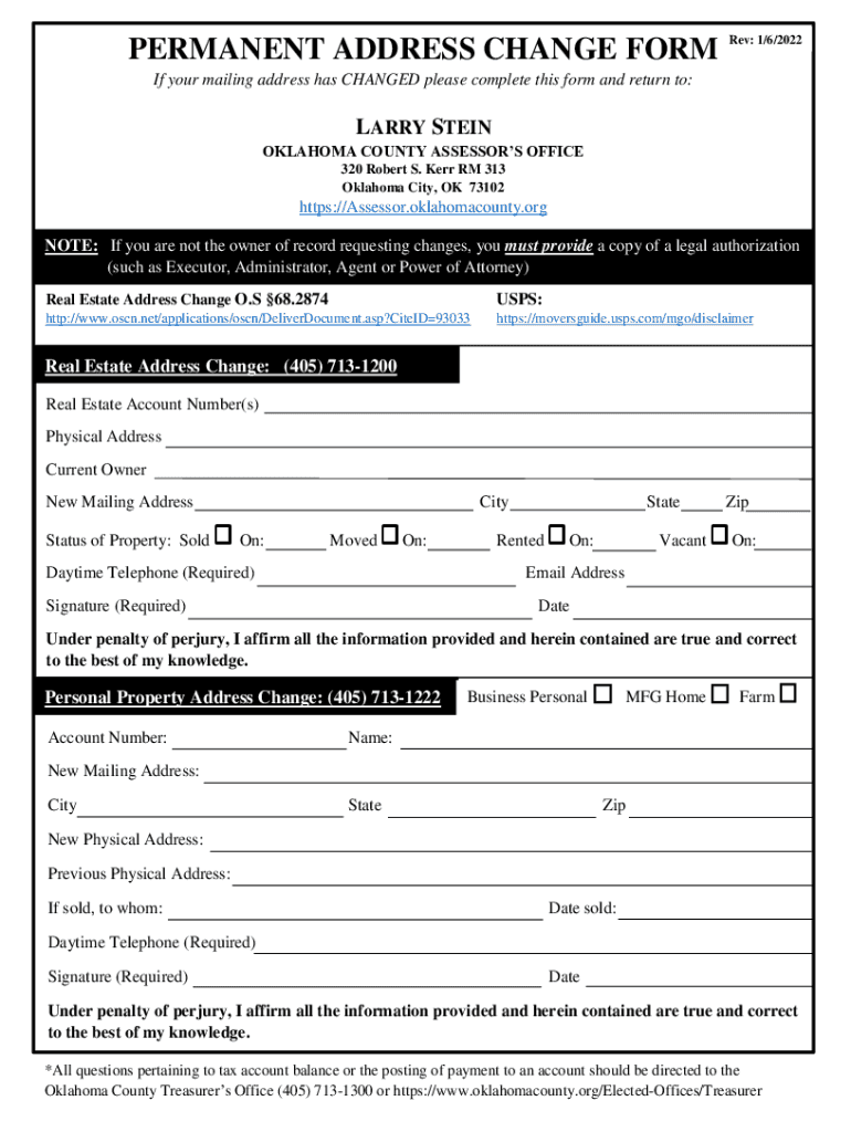 PERMANENT ADDRESS CHANGE FORM Rev: 1/6/2022If your mailing address has CHANGED please complete this form and return to:LARRY STEIN OKLAHOMA COUNTY ASSESSORS OFFICE 320 Robert S. Kerr RM 313 Oklahoma